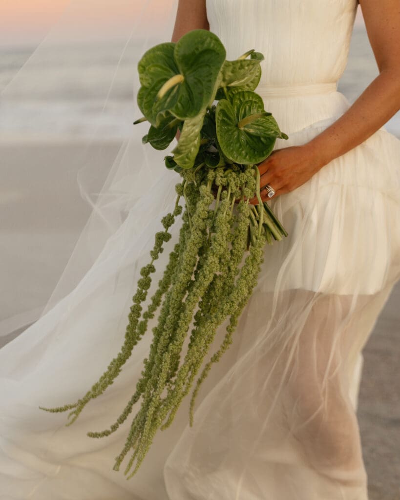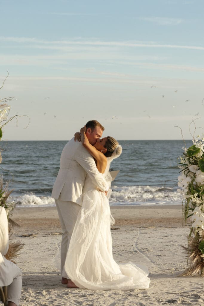 Coastal-inspired florals by Flora by Hannah enhanced the natural beauty of the beach setting. The arrangements were soft, organic, and airy — perfectly complementing the serene ocean backdrop and giving the ceremony a relaxed yet refined coastal wedding vibe.