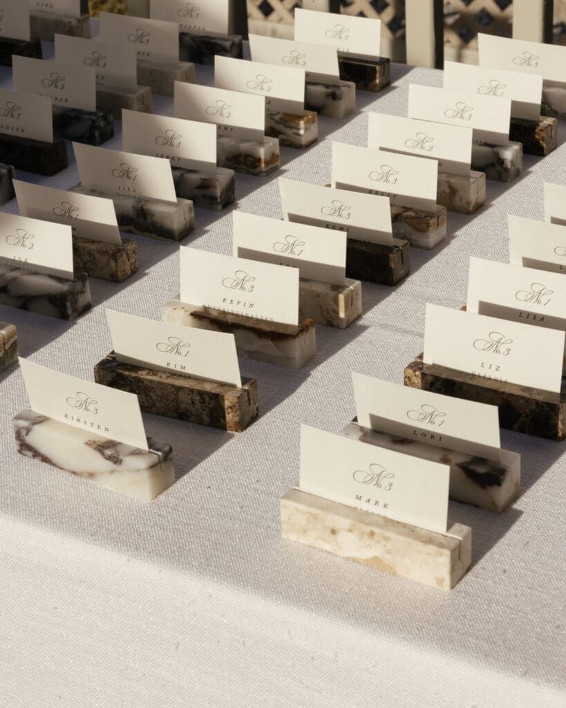 Lauren Elizabeth, a talented home décor designer with her own line, created custom marble place card holders for the escort display. These served double duty: they held each guest’s place card and became gorgeous keepsake favors to take home. It was a detail that perfectly reflected the couple’s style, added a touch of luxury, and made each guest feel celebrated.