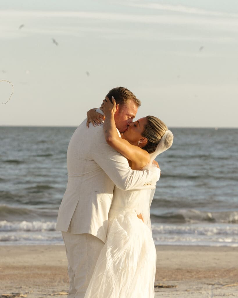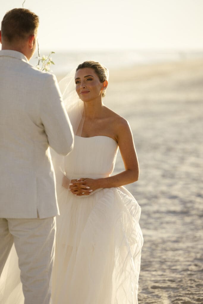 The ceremony took place right on the beach during golden hour, just before sunset. The soft, warm light reflected off the ocean and framed the couple in a naturally romantic glow, creating the kind of moment that looks like it belongs in a magazine. Their daughter, Olive, was an integral part of the ceremony, adding sweetness and family-centered meaning that made the celebration even more special.