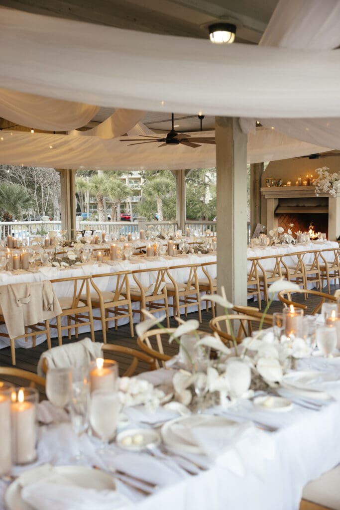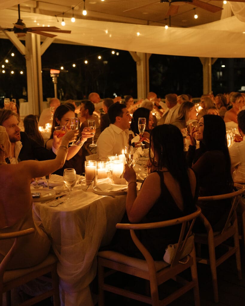 The reception, located steps from the ceremony site at the Omni Hilton Head Oceanfront Resort, was designed to feel like a refined coastal dinner party. Elegant linens, soft candlelight, and subtle floral accents provided a sophisticated backdrop while keeping the focus on the family, friends, and joyful energy of the night.