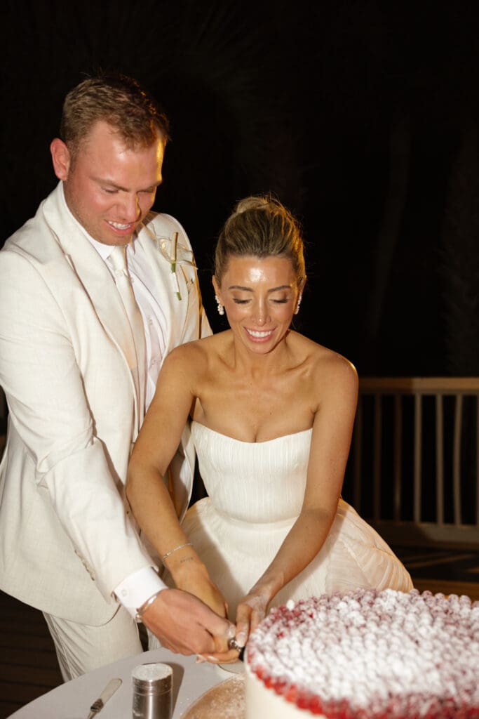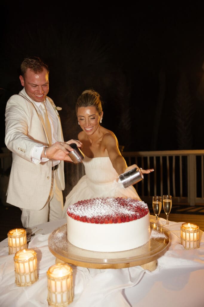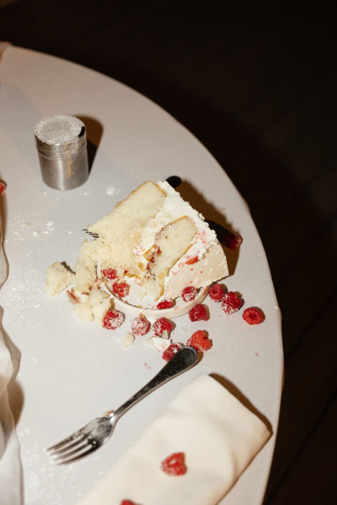 One of my favorite moments of the evening was Lauren and Matthew’s unique cake-cutting ritual. Instead of a traditional slice, they opted for a powdered sugar shake — dusting their gorgeous, raspberry topped cake designed by Daniel of DFlavor Custom Cakes, together before cutting it. It was playful, personal, and perfectly in tune with the intimate and family-focused vibe of their wedding. This kind of detail is exactly what makes intimate weddings so memorable: personal touches that truly reflect the couple’s personality.